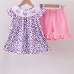 Purple leopard butterfly smocked shorts set - 12 Months is backordered and will ship as soon as it is back in stock.