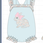 Blue floral bunny applique ruffle bubble - 3 Months is backordered and will ship as soon as it is back in stock.