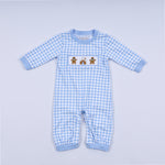 Blue gingerbread hand smocked gingham romper - 3 Months is backordered and will ship as soon as it is back in stock.