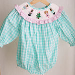 Deck the halls with this whimsical mint-hued bubble featuring a charming Christmas nutcracker design! Hand-smocked gingham detailing adds a touch of vintage holiday magic to this playful piece. Perfect for little ones who love festive flair, this bubble combines classic holiday spirit with modern style. The soft mint colorway keeps things fresh and cheerful, while the intricate smocking showcases quality craftsmanship. Ideal for holiday gatherings, family photos, or spreading seasonal cheer all season long!
