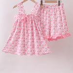 Twirl into spring with this adorable pink floral print shorts set! Featuring delicate bow details and charming ruffles, it's the perfect blend of sweet and stylish. The soft floral pattern brings a cheerful vibe to any wardrobe, while the coordinated two-piece design makes getting dressed effortless. Ideal for playdates, casual outings, or just spreading joy wherever you go. Comfort meets cuteness in this must-have set!