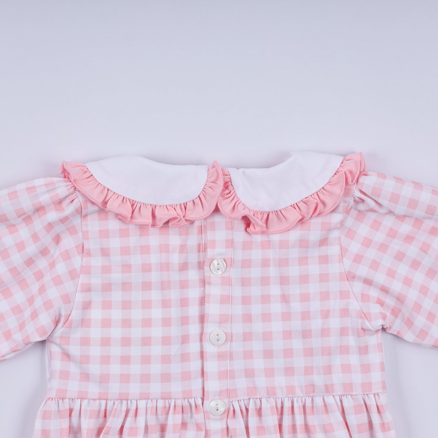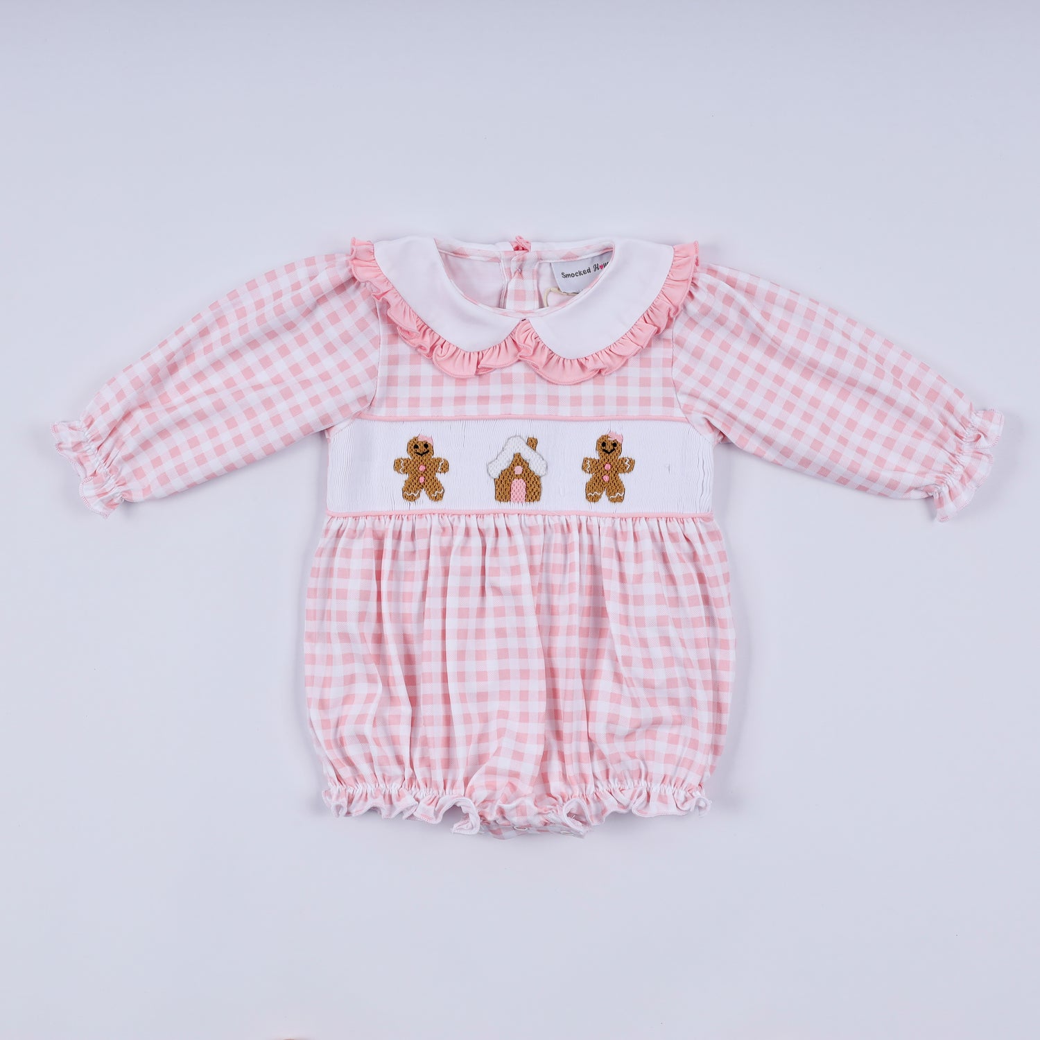 Pink gingerbread hand smocked gingham ruffle bubble