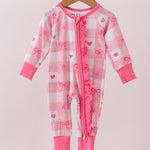 Pink heart checkered bamboo ruffle pajama zipper romper