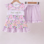 Purple floral Jesus loves me embroidery shorts set