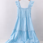 Elevate your wardrobe with this charming blue smocked ruffle tiered dress. The delicate smocking detail at the bodice creates a flattering, gathered silhouette, while cascading ruffled tiers add playful movement and dimension. Perfect for casual outings or dressed-up occasions, this versatile piece combines vintage-inspired elegance with modern comfort. The soft blue hue complements all skin tones, making it an easy go-to for any season.