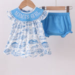 Mama's little one will look absolutely adorable in this charming bloomer set! Featuring delicate "mama's girl" embroidery and sweet ruffled details, this blue two-piece is perfect for playdates, photos, or everyday wear. Soft, comfortable fabric keeps your little guy happy all day long, while the classic design pairs easily with any outfit. A must-have for parents who love coordinating styles with their little ones!