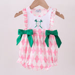 Green golf embroidery ruffle bubble - 9 Months is backordered and will ship as soon as it is back in stock.