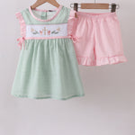Green swiss dot cross sheep ruffle shorts set