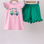 Adorable two-piece set featuring a charming golf cart applique on the front. Soft pink fabric with contrasting stripe detailing and playful ruffle trim along the shorts legs. Perfect for warm weather playdates, casual outings, or themed events. Comfortable fit with elastic waistband for easy movement. A fun, eye-catching addition to any child's wardrobe.