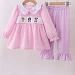 Adorable pink seersucker pants set featuring charming puppy embroidery and delicate ruffles for an extra dash of sweetness. The textured seersucker fabric offers breathable comfort perfect for warm weather play, while the playful puppy design and frilly details make getting dressed fun. Ideal for little ones who love cute animal prints and feminine touches. A delightful addition to any child's wardrobe that's sure to bring smiles.