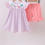 Adorable purple dinosaur-themed shorts set featuring charming smocked detailing and gingham patterns. The ruffled design adds playful movement and dimension to this delightful piece. Perfect for little ones who love dinosaurs and classic, timeless style. Soft, comfortable fabric makes it ideal for everyday wear, playdates, or special occasions. A fun wardrobe staple that combines whimsy with quality craftsmanship.