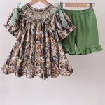 Camouflage smocked bow ruffle shorts set - 12 Months is backordered and will ship as soon as it is back in stock.