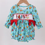 Whimsical and wonderfully wearable, this mint bubble features a charming smocked bow detail inspired by the imaginative world of Dr. Seuss. The soft, dreamy color pairs perfectly with the playful design, creating a delightful piece that celebrates classic storybook charm. Ideal for little ones who love whimsy and comfort in equal measure.
