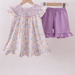 Purple floral smocked ruffle shorts set - 12 Months is backordered and will ship as soon as it is back in stock.