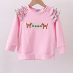 Adorable pink top featuring charming puppy and clover embroidery details that bring personality to any outfit. Delicate ruffles add a whimsical touch perfect for playful style lovers. Soft, comfortable fabric makes it ideal for casual wear or special occasions. A sweet statement piece that celebrates fun, quirky fashion with undeniable charm.