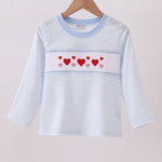 Adorable blue striped top featuring delicate heart smocking across the chest—perfect for adding a touch of whimsy to any wardrobe. The smocked detailing creates flattering texture and gentle gathering, while the cheerful stripe pattern keeps things fun and fresh. Versatile enough for casual days or dressed up for special occasions, this charming piece brings personality and comfort together in one sweet design.