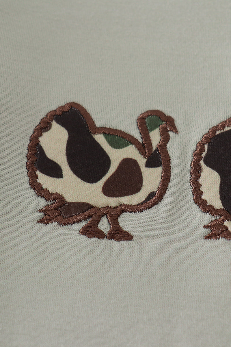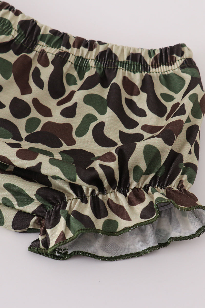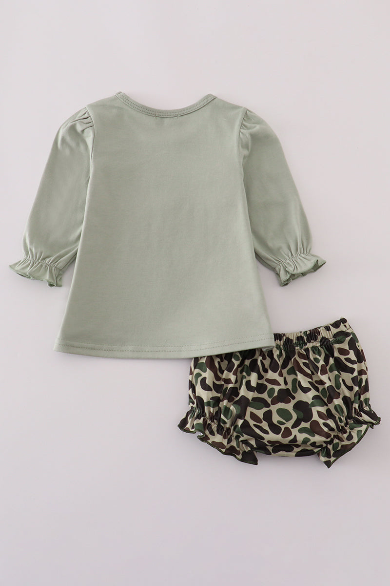 Sage camouflage turkey applique bloomer set - 18 Months is backordered and will ship as soon as it is back in stock.