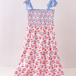 Blue cherry smocked tiered mom&me dress - M is backordered and will ship as soon as it is back in stock.