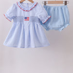 Blue flag smocked ruffle bloomer set - 12 Months is backordered and will ship as soon as it is back in stock.