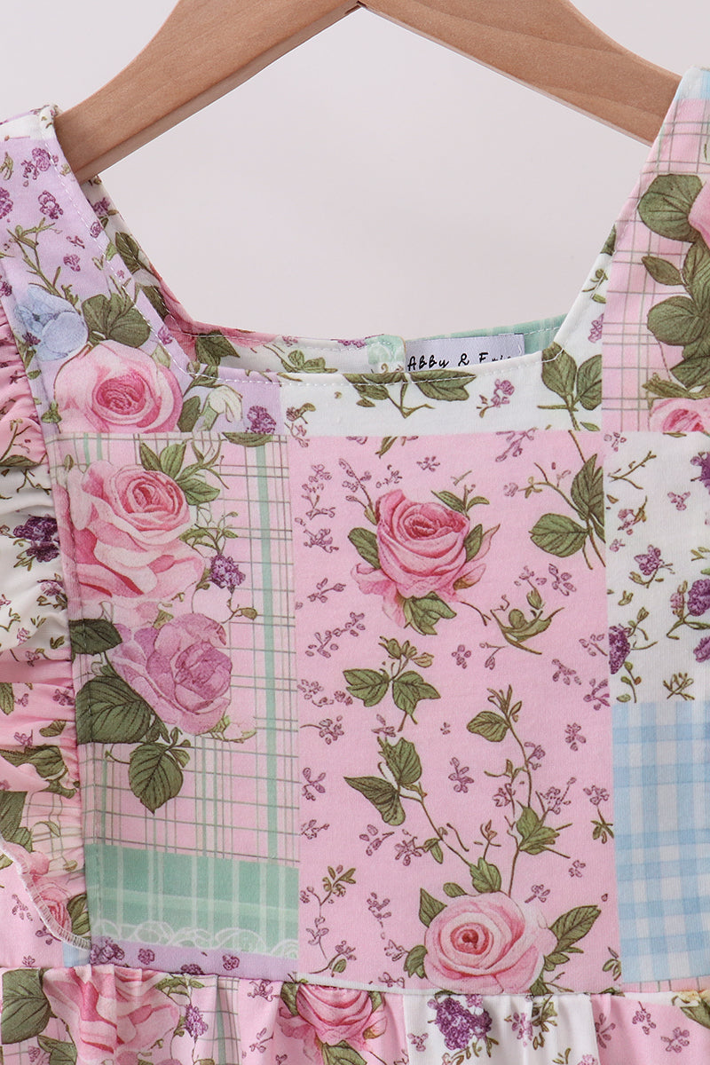 Purple floral checkered ruffle jumpsuit - 12 Months is backordered and will ship as soon as it is back in stock.